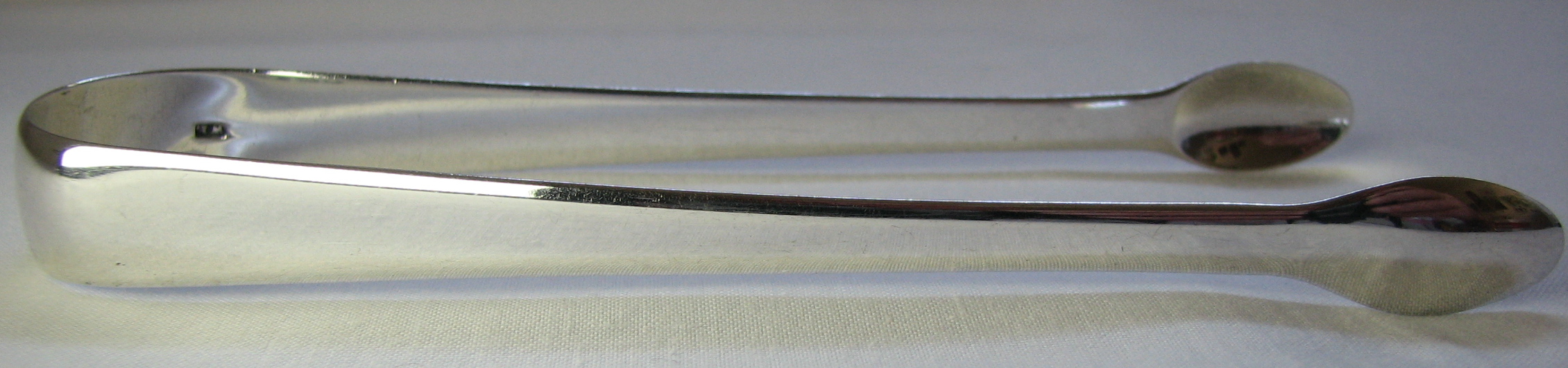 These tongs are also completely plain, but this time do not have a concave bow. They have an elaborately engraved monogram that appears to be "TEB". They are dated 1804 (before the duty mark was clipped in October 1804).