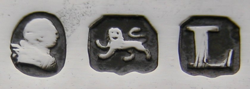 These are an interesting pair of tongs. They have a double thread edge and are fiddle pattern. The fiddle pattern is slightly different in that the top half of the arms is curved rather than the normal more angular style. The tops of the thread edge are curved into a nice inverted "V" shape. These tongs are dated 1806/07. They are in excellent condition although they do have some verdigris marks. They weigh 50.7 grams.