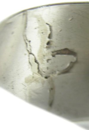 A repair to the bow. Notice the faint discoloured line in the centre, partly disguised by the fact that the monogram is partially worn away. A close look will also show that the engraved edging is not complete, partly "broken" both top and bottom.