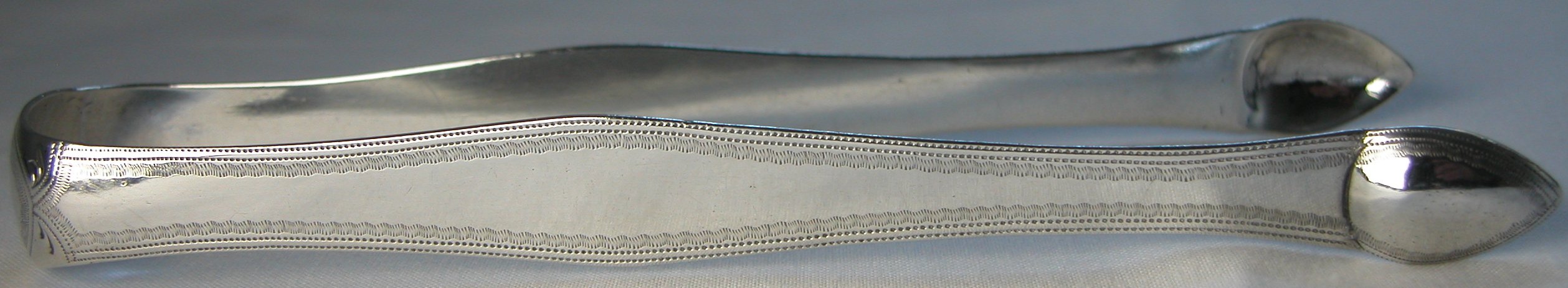 This is a pair of fairly plain flared tongs with just a light feather edge engraving. They are dated 1807.