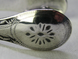 These are another pair of lovely shaped, bright cut tongs. They have cut-in shoulders and the characteristic three protrusions at the tops of the arms. They have circular bowls but these have only a fairly standard engraved pattern on them. These tongs have the expected hallmark seen on sugar tongs with the date letter in a small cartouche, surmounted by a crown. They have the incuse duty mark, dating them at 1785. They also have a somewhat skew wiff marriage or betrothal monogram. Click on any picture to enlarge |
