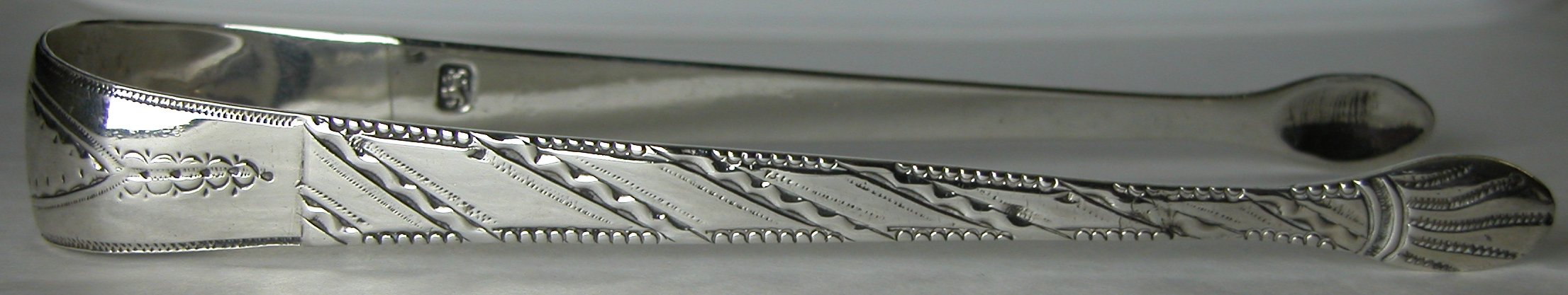 These tongs are a beautiful example of early tongs made in three parts. The arms can very clearly been seen as having been made separately to the bow. They have a delightful engraved pattern to them. I would suggest that they date between 1773 and 1775.